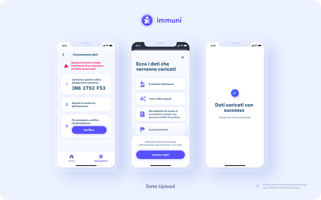 In questa sezione c’è inoltre un box “Gestione dati” in cui troviamo la funzione caricamento dati da cui in futuro, se dovessimo risultare positivi al Covid- 19, con l’assistenza di un operatore sanitario autorizzato si potrà comunicare il nostro codice per attivare tutto il sistema di segnalazioni a chi è stato a stretto contatto con noi.