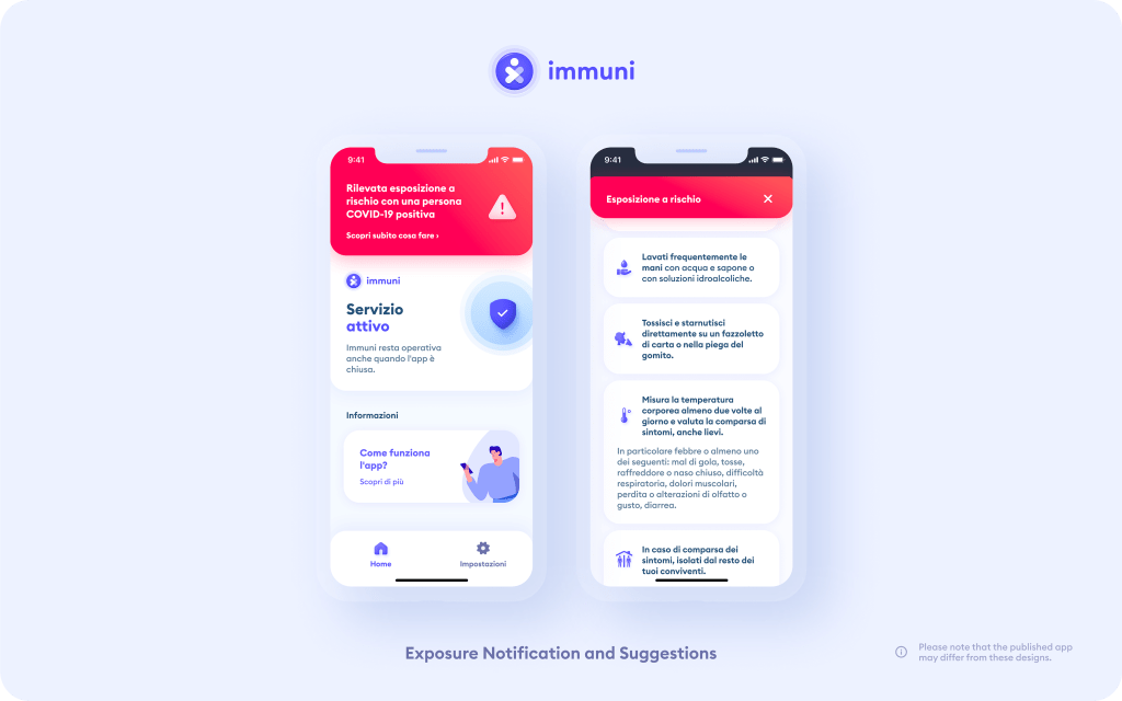 Quando le strutture sanitarie e le Asl riscontrano un nuovo caso positivo, dopo aver ricevuto il consenso del soggetto contagiato, gli operatori sanitari inseriscono un codice nel sistema. A questo punto il sistema invia una notifica agli utenti con i quali il positivo è stato a stretto contatto per un tempo e una distanza tali da poter causare un contagio (circa nel raggio di 2 metri per 15 minuti). La notifica avverte gli utenti che hanno scaricato l’app che hanno avuto un’esposizione a rischio, questi utenti possono poi isolarsi per evitare di contagiare altre persone e contattare il proprio medico curante in modo da ridurre il rischio di complicanze intervenendo tempestivamente.