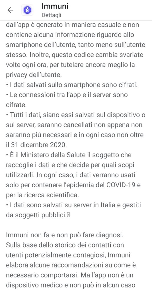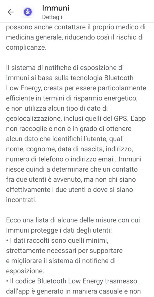 Nell’ultima schermata vediamo “La tua privacy è tutelata. L’app funziona senza seguire i tuoi spostamenti e senza conoscere la tua identità o quella delle persone con cui entri in contatto scopri di più”. Cliccando su “Scopri di più” entriamo in una sezione in cui ci viene spiegato più nel dettaglio come funziona l’app i cui approfondimenti sono su come Immuni associa a ogni telefono un codice casuale, su come i telefoni che si incontrano si scambino i rispettivi codici casuali, su come chi risulta positivo sceglie se condividere i propri codici casuali, su come ogni telefono verifica se ha incontrato in precedenza uno o più dei codici condivisi e su come in caso di riscontro positivo, l’utente viene avvertito.