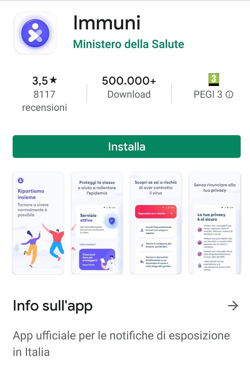 Innanzitutto vado nel Google Play Store perché io ho un dispositivo Android e cerco l’app Immuni. Qui sotto vi metto tutte le informazioni messe a disposizione consultabili prima di installare l’applicazione.