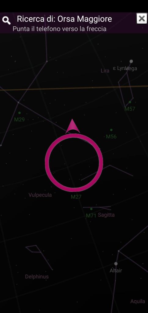 Una volta installato, entro nell’applicazione e in alto a destra trovo un pulsante a forma di lente con cui posso cercare “Orsa Maggiore” e a questo punto mi compare un cerchio con una freccia che mi dice verso che posizione spostare lo sguardo per trovarla.