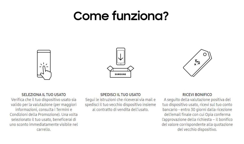 Concretamente, Samsung valuta il vostro dispositivo usato, in base allo stato, e vi offre uno sconto chiamato “Valore della Valutazione” che vi verrà accreditato tramite bonifico sull’IBAN da voi fornito, in seguito a vostra spedizione e loro ricezione del vostro dispositivo usato.